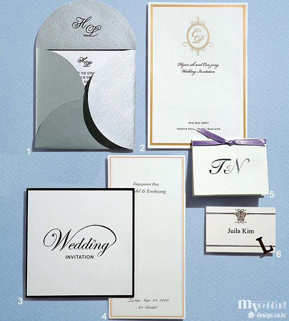 5실버 컬러로 신랑 신부의 이니셜을 장식한 미니 카드. 예랑카드. 6참석할 손님의 이름을 적은 네임 카드. 민트카드.