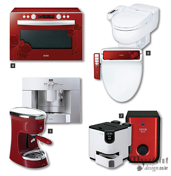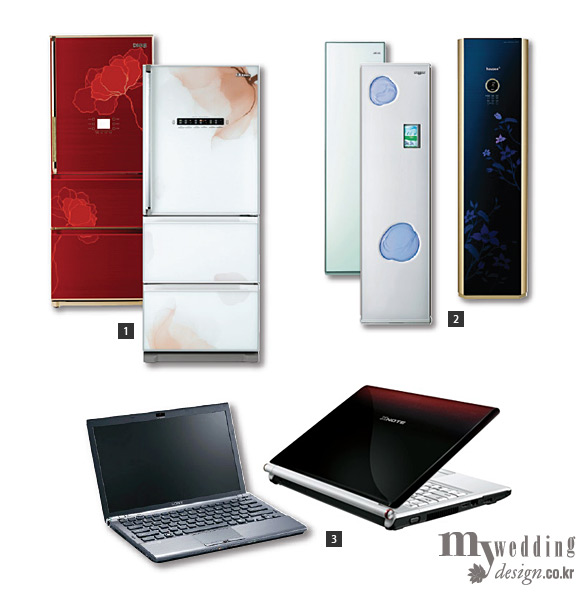 몇 년 전만 해도 선택 사항이었던 김치냉장고가 이젠 대부분의 예비 신부에게 필수 혼수로 자리 잡았다. 설문 응답자 100명 중 78명이 꼭 구입하겠다고 답해 1위에 오른 것. 요즘에는 김치뿐 아니라 야채, 과일, 육류, 와인 등을 신선하게 보관하는 ‘세컨드 냉장고’로 쓰인다. 최근 유류비 증가 등의 영향으로 저가형 제품을 많이 찾는 추세로 가격은 일반형 100만원대, 프리미엄급 200만원대. 뚜껑식, 콤비형, 스탠드형 중에서 원하는 형태를 고른 다음 숙성, 발효, 생동(살얼음), 냉동, 와인 보관 등 필요한 기능을 고려해 구매하자. 또 김치 숙성 시 발생하는 냄새를 없애주는 탈취 기능을 확인하고 용기가 사용하기 편리하고 견고한지도 살펴본다.