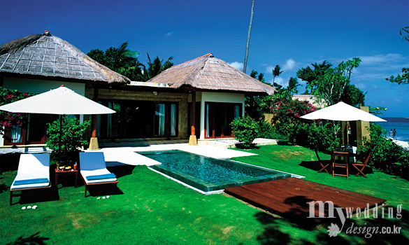둘만의 오붓한 시간을 즐기고자 하는 신혼 여행객이라면 뭐니 뭐니 해도 풀빌라가 제격이다. 고급스럽고 쾌적할뿐더러 자연과 어우러진 시설은 그 누구의 방해도 받지 않는 조용하고 프라이빗한 분위기를 충족시켜주기 때문이다. 침대에 누워서도 인도양의 일출과 일몰을 감상할 수 있도록 통유리로 마감된 투 베드룸 풀빌라. 독립된 출입구와 넓은 개인 수영장, 인도양이 한눈에 보이는 단독 정원, 수영장 사이로 가지런히 놓인 선데크, 해 지는 것을 감상하며 만찬을 즐기는 야외 테이블, 발리 전통의 야외 샤워장 등이 완벽해 정원에서 시간을 보내는 것도 흥미롭다. 또 대리석 욕조 시설을 완비한 실내 욕실, 대리석 바닥과 서양식 인테리어가 고급스러운 분위기를 자아내는 거실, 멋스러운 주방 등 완벽한 시설을 갖추었다. 또 정원에 넓은 통나무 2층 집이 있어서 둘만의 이색적인 공간으로 활용하기 좋다. 시원한 에어컨 바람이 실내를 항상 쾌적하게 유지해주며 거실을 경계로 두 개의 마스터 베드룸이 있다. 각 방에는 흰색 침구와 깔끔하게 정리된 베개, 발리 전통 스타일의 가구, 세면대와 화장실, 야외 욕조, 트렁크도 들어가는 널찍한 옷장이 두 세트씩 세팅되었다. 24시간 룸서비스가 가능하며 빌라 고객만을 위한 전용 버틀러 서비스가 준비되어 언제든지 현관 옆의 벨을 누르면 상냥한 직원의 신속한 서비스를 받기 편리하다.