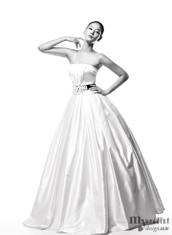새틴 실크의 찬란한 광택이 고급스러움을 더하는 튜브톱 스타일 A라인 웨딩드레스. 비즈로 장식한 벨트가 포인트. 주얼리 쇼메.