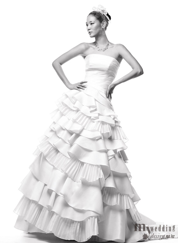 사선으로 흐르는 듯 리듬감이 느껴지는 러플로 스커트 전체를 장식한 튜브톱 스타일 웨딩드레스. 고급 소재인 오간자 실크와 심플한 디테일만으로 고혹적인 신부의 자태를 완성시킨다. 목걸이 쇼메.