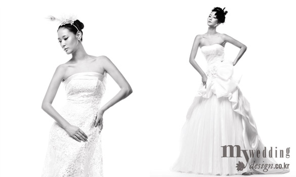 (왼쪽) 가슴선을 베이지색 실크로 가볍게 감은 튜브톱 스타일 웨딩드레스. 드레스 전체에 사용한 레이스가 고급스러움을 더욱 살려준다. 헤어밴드 코사지 by 이승희.