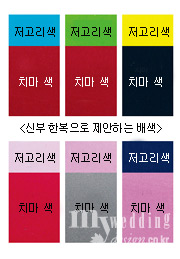 한복은 색상, 명도, 채도로 우아한 느낌, 지적인 느낌, 개성적인 느낌 등 다양한 분위기를 표현하기 때문에 두 가지 이상의 색상을 조화롭게 맞추는 배색이 중요하다. 한복은 평소 입는 양장과는 많이 다른데 요즘 신부들 중 양장으로 입는 배색을 고집하는 경우가 종종 있다. 회색과 같은 무채색 계열을 입고자하는데 이런 배색은 자칫 나이 들어 보이기 때문에 전문가와 충분한 상담 후 제작에 들어가는 것이 좋다. 전체적인 분위기를 결정하는 배색은 개인의 취향도 중요하지만 전문가 의견을 수렴하는 것이 후회 없다. 전통적인 배색으로는 결혼 전 처녀일 때는 분홍치마에 노랑저고리, 결혼식 관례복으로는 녹색 저고리에 빨강 치마인 녹의홍상을, 결혼 후에는 남색 치마에 분홍 저고리 또는 옥색 저고리를 입는다. 같은 녹의홍상이라 하더라도 신부의 피부 톤에 따라 창백한 피부라면 다소 따뜻한 연둣빛으로 붉은 기가 많이 도는, 피부는 노란연두가 잘 어울린다. 피부가 까무잡잡한 신부는 원색의 배색으로 하되 체격이 너무 뚱뚱하지 않다면 어두운 색보다는 밝은 원색이 좋다. 작고 마른 체형의 신부는 명도가 높고 밝은 색상을 선택하고 뚱뚱한 체형은 채도가 낮고 짙은 색상을 선택하면 체형이 축소되어 보인다. 키가 작다고 치마와 저고리를 비슷한 색으로 하면 자칫 나이 들어 보일 수도 있으니 적당히 채도를 높게 조절해주도록 한다. 신부다운 느낌을 연출하고 싶다면 홍색 치마(빨강, 분홍, 다홍)에 연두, 연노랑, 파랑, 하늘색, 초록, 분홍 등 화사한 색감의 저고리를 선택하면 된다. 보통 남색 치마에는 옥색, 미색, 흰색, 다홍 저고리가 잘 어울리며, 흑자주 치마에는 분홍, 미색, 옥색, 노란색, 회색 저고리가 안정감을 주는 배색이다. 북청색 치마에는 옥색, 연두색, 분홍 저고리가, 다홍치마는 은은한 연두색이나 흰색, 남색 저고리가 잘어울린다. 화려한 느낌을 원한다면 남색 치마에 원색의 노랑, 빨강, 초록을 택하되 장식을 배제해야 세련된 분위기를 강조할 수 있다. 최근에는 회청색, 아이보리, 황색 등의 파스텔 톤이나 부드럽게 가라앉은 천연 염색 톤도 인기가 높으며 색상을 달리해 깃과 끝동, 고름 등에 배색을 넣는 것도 세련되어 보인다. 모든 배색은 소재에 따라 달라질 수 있으므로 같은 색이되 여러 가지 소재를 얼굴에 대어보고 고르도록 한다.Step3 디자인