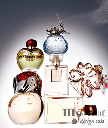 (왼쪽 아래부터 시계 방향) 반클리프 아펠 오리엔스 태양을 머금은 재스민과 파촐리, 앰버와 바닐라의 관능미가 플로럴 노트를 감싸며 거부할 수 없는 매력적인 향을 완성한다. 30ml 6만2000원. 모스키노 글래머 만다린 플라워와 웜우드가 깔끔한 시 솔트와의 조화로 깊은 황홀함으로 인도한다. 벨벳처럼 부드러운 히비스커스, 이국적인 수련, 세련된 오키드 향, 앰버와 시더우스가 마지막 유혹을 펼친다. 30ml 5만7000원. 반클리프 아펠 페어리 오 드 퍼퓸 바이올렛과 아이리스, 로즈가 탄생시킨 브라이트 우드 플로럴 향조가 우아하면서 고급스럽게 후각을 자극한다. 50ml 12만원. 롤리타 렘피카 씨 롤리타 핑크베리의 톱 노트와 결합된 절묘한 시트러스 향이 피부를 감싼다. 자유롭고 센슈얼한 파리지엔의 열정을 상징하는 플로럴 스파이시 향. 30ml 6만5000원. 샤넬 알뤼르 센슈얼 부르봉 바닐라, 파촐리 앰버가 결합된 향수. 이국적인 장미와 재스민에 아이리스 앱솔루트가 결합되어 도발적인 향을 강조한다. 50ml 12만8000원. 샤넬 코코 마드모아젤 오 드 퍼퓸 베르가모트와 오렌지에서 추출한 톱 노트가 강렬한 향. 은은한 로즈버드와 이탤리언 재스민이 어우러져 미들 노트를 형성하며 파촐리 성분이 섹시한 매력을 발산한다. 35ml 8만6000원.