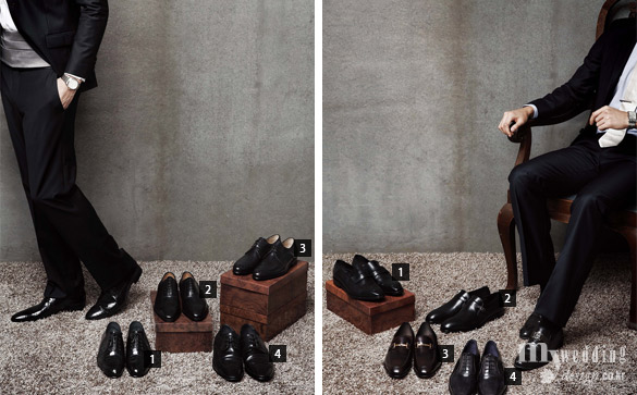 결혼식 날 신랑들이 가장 많이 선택하는 블랙 턱시도에는 매끈한 블랙 슈즈를 매치하는 것이 정석. 블랙 옥스퍼드 스타일이 제격이다.