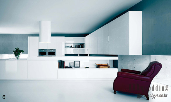6 화이트 단일 컬러 사용으로 깔끔한 주방을 연출한 세자르 야라. 인조 대리석 페닌슐러 카운터와 하이글로시 소재의 도어는 화사하고 밝은 신혼집 분위기를 완성하는 포인트다. 가격미정 세자르 야라.