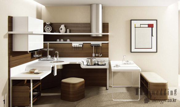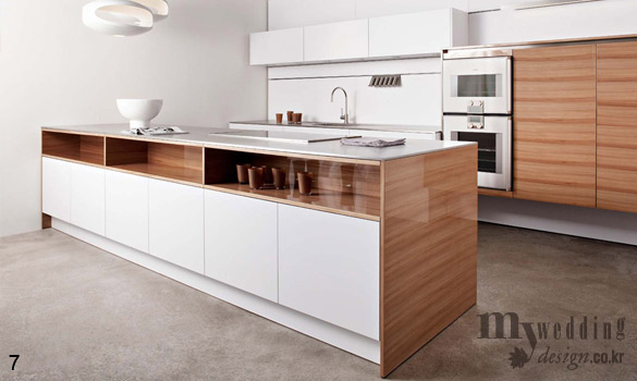 신부가 집에서 가장 오래 머무는 장소인 만큼 무엇보다 편안함이 중시되는 주방. 나무의 자연스러운 질감과 색상, 여기에 밝고 산뜻한 느낌의 화이트 컬러를 더하면 한층 안락하고 심플한 주방이 완성된다.