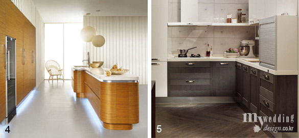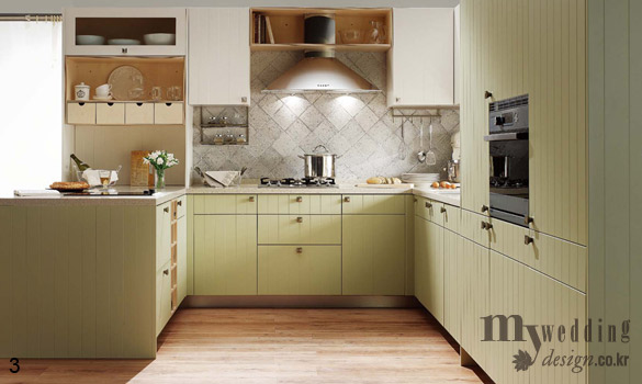 3 자작나무 소재로 따뜻하고 산뜻한 느낌이 신혼 주방에 잘 어울리는 리첸 미누트. 아이보리, 블루 그레이, 올리그브린 세 가지 색상으로 자연스러운 멋이 돋보인다. 가격미정 리첸.