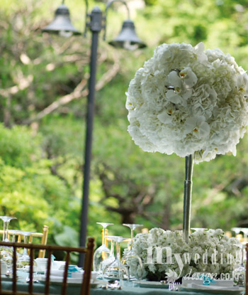 야외에 나들이를 나온 듯 여유로운 자연을 만끽하는 하객들, 턱시도와 드레스를 맞춰 입고 들러리로 등장한 신랑 친구들, 새하얀 캐노피로 연출한 로맨틱한 신부 대기실, 버진 로드로 이용하는 나무 데크를 가득 뒤덮은 새하얀 꽃잎 장식, 나무와 바위, 테이블, 길 위에 장식된 수백 개의 캔들, 이젤을 세워 곳곳에 전시한 웨딩 사진…. 모든 요소가 영화 속 한 장면처럼 더없이 로맨틱하고 아름다웠다. 또 더운 날씨를 고려해 전체적인 리넨은 티파니 블루 컬러를, 플라워는 화이트 컬러를 사용해 시원하면서도 우아한 느낌을 주었고, 테이블 센터피스는 화려하고 웅장하게 볼륨을 주어 시선을 사로잡았다.