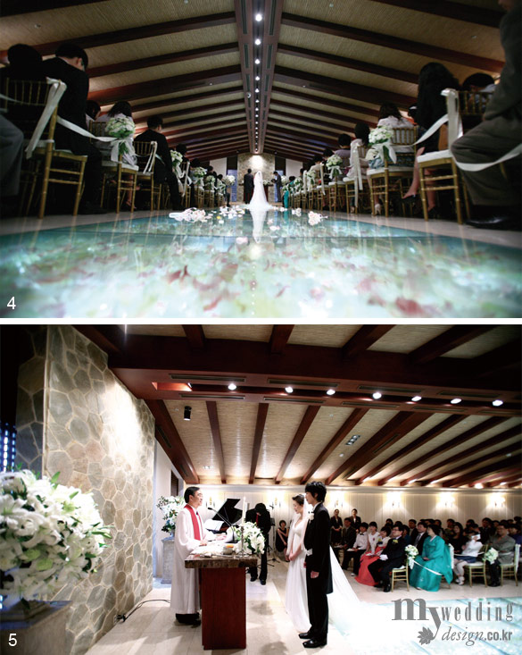 4 버진 로드 바닥을 유리로 깔고 꽃으로 장식한 뒤 조명을 비춰 신랑 신부의 모습이 더욱 빛난다.