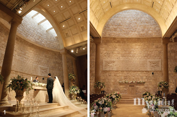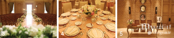 1,2 유럽 고성에서 올리는 귀족들의 예식이 연상되는 ‘캐슬 웨딩’을 더 라움에서 실현했다. 프랑스 남부 부르고뉴석으로 장식한 전면의 천장 위에서 자연광이 들어와 그 어떤 조명보다도 성스러운 분위기를 연출한다.