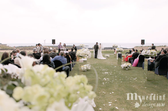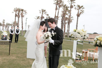 다행히 날씨가 좋아 시사이드 웨딩은 순조로웠고 식후에는 연회장에서 간단한 칵테일 리셉션이 있었다. 결혼식에는 심플한 화이트 톱 드레스와 블랙 턱시도를 입었다. 의상에서 가장 기본적인 스타일을 추구했듯이 장식도 야외와 자연스럽게 어울릴 수 있는 화이트와 그린으로 심플하게 선택했는데 리조트 야외의 푸른 잔디와 잘 어우러져 하객들의 만족도도 높았다. 기억에 남는 건 상황이 상황인지라 사회자 두 분을 모셔야 했다는 것. 신랑 친구가 영어를, 신부 친구가 한국어를 맡았다. 혼인 서약도 한국어 한 번, 영어 한 번 이렇게 번갈아했고 축가는 신랑 친구가 맡았다. ‘Let’s Fall in Love’라는 곡이었는데 반주가 나오는 부분에서 이 좋은 노래에 왜 아무도 춤을 추는 사람이 없냐는 멘트에 이들 커플은 그동안 한 번도 추지 않은 춤을 추며 많은 이들의 기억 속에 오래오래 남는 장면을 하나 더했다.