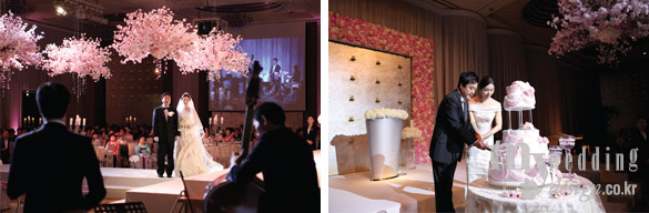 (왼쪽) 아름다우면서도 우아한 예식 공간을 원한 예비 신부의 취향을 만족시킨 핑크 컬러 조명과 플라워 데커레이션이 로맨틱한 롯데호텔서울.