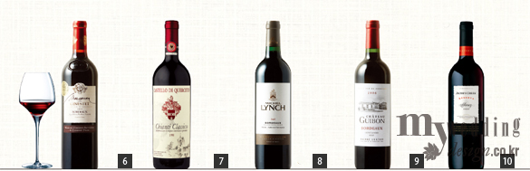 8 미쉘 린치 보르도 메를로 카베르네 소비뇽 2008 보르도 지방의 메를로 90%에 카베르네 소비뇽 10%를 혼합해 엷은 홍색을 띠며 신선한 맛과 풍부한 과일 향이 특징인 레드 와인. 초보자도 쉽게 즐길 수 있는 메를로 품종과 깊고 풍부한 맛의 카베르네 소비뇽을 섞어 풍부한 풍미와 잘 짜인 균형미, 완숙한 타닌 맛을 느낄 수 있다. 4만4000원 (주)동원와인플러스.