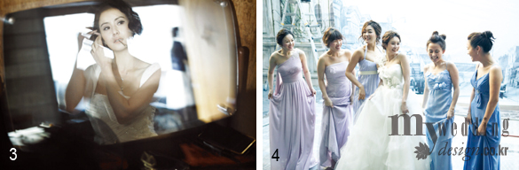 몇 년 전 SBS <골드 미스 다이어리>를 통해 솔직한 모습으로 신랑감을 찾던 배우 최정윤이 드디어 반쪽을 만났다. 그 행운의 반쪽은 바로 윤태준 씨. 이랜드 그룹 부회장의 장남이라는 사실 때문에 방송가에서 한바탕 화제가 되기도 했던 그는 반듯한 외모의 훈남으로, 이날 리허설 촬영 현장에서도 최정윤과 함께 분위기 메이커로서의 역할을 톡톡히 했다. 신부 어머니와 지인들이 지켜보는 가운데, 최정윤은 사랑스러운 숙녀와 우아한 여인의 경계를 넘나들며 팔색조다운 매력을 과시했다. 특히 그녀가 베즐리 미슈카의 원 숄더 드레스를 입고 나왔을 땐 신랑은 물론 스태프들까지 모두 탄성을 터뜨렸다. 이들의 스타일링을 책임진 프리마베라 정민주 대표는 그녀의 조언을 기꺼이 수용한 최정윤에게 남다른 애정을 표했다.