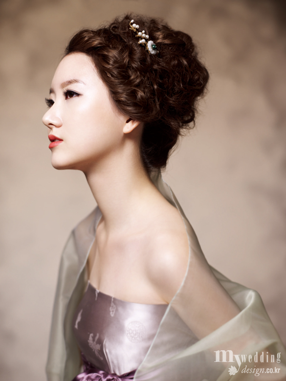 Hair 앞머리 선을 따라 땋아서 옆선까지 연결한 후 나머지 뒷부분은 풍성하면서 자연스러운 웨이브를 넣어 올려 고혹적인 분위기를 완성했다. 옆선을 따라 마치 헤어피스처럼 장식한 뒤꽂이가 신부를 더욱 돋보이게 한다.