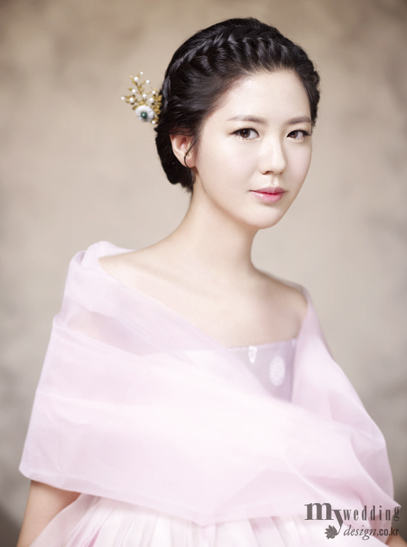Make-up 한복 드레스의 분홍빛을 배제한 세련된 메이크업을 위해 아이라인과 위아래 속눈썹으로 눈매를 또렷하게 강조했다. 볼과 입술은 피부 톤을 화사하고 깨끗하게 살릴 수 있도록 채도 높은 컬러를 사용했다.