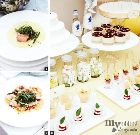 5 Table Decor & Food 블루와 화이트 컬러를 메인으로 조팝나무, 흰 수국, 파란 수국, 옥시덴타늄과 바람개비가 장식된 옐로 컬러의 네임 카드와 메뉴 카드가 함께 장식됐다. 테이블에 놓인 음식은 ‘보나세라에 꽃이 피다’라는 테마로 저염식으로 칼로리를 줄인 건강식을 제안한다. 그릴에 구운 채소와 보코치니 모차렐라 샐러드, 양파 수프, 보나세라에서 직접 만든 면을 사용한 끼따라 파스타, 더덕과 원추리로 봄의 싱그러운 식감을 느낄 수 있는 안심 스테이크 등이 준비됐다.