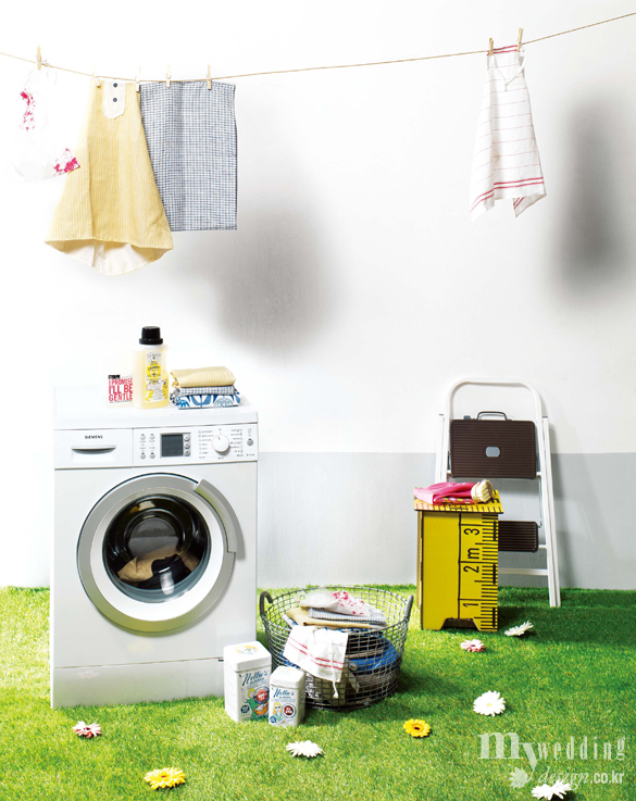 비교적 깨끗한 빨래의 경우 슈퍼15 프로그램을 이용하면 단 15분 만에 세탁을 끝마칠 수 있다. 빨랫줄에 걸린 패브릭은 샐리가든, 2단 사다리는 도데카 제품. 나머지는 스타일리스트 소장품.