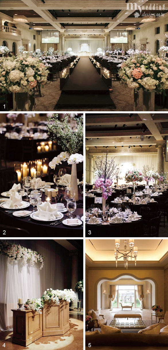 버진 로드 샹들리에의 화려한 빛과 테이블별 형형색색의 센터피스가 어우러진 버진 로드는 캔들만으로 간결하게 꾸몄다. 대신 단상을 그린과 화이트 컬러 꽃으로 생동감 있게 단장해 하객들의 시선을 집중시켰고, 마지막 퇴장 시 버진 로드 끝에서 플라워 샤워 세리머니를 하는 이벤트를 했다.