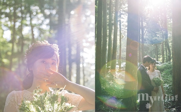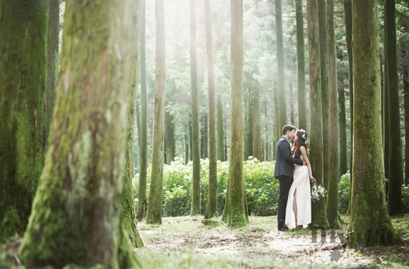 울창한 삼나무가 아름다운 자연휴양림으로 나뭇가지 사이로 햇살이 비치는 순간의 웨딩 사진이 환상적.
