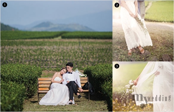 넓은 대지에 푸른 녹차 밭이 수평선 너머까지 펼쳐지며 서정적인 분위기의 웨딩 사진을 완성할 수 있다.