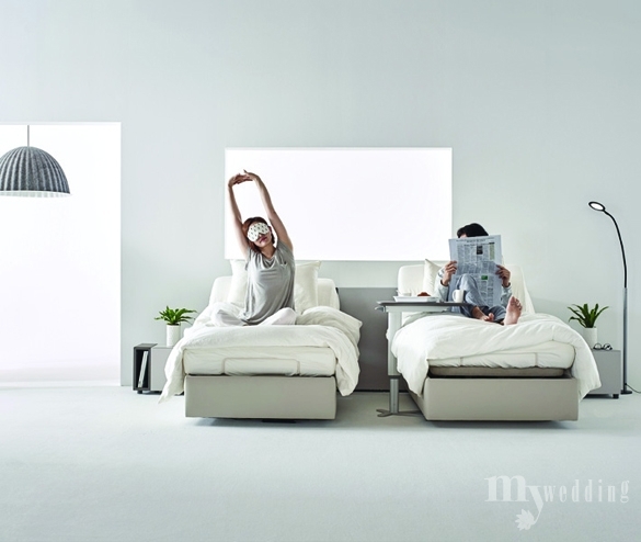 독립적인 플랫폼을 갖춘 싱글 침대 2개가 나란히 놓인 구성으로, 각각의 등판과 다리판 각도를 따로 조절할 수 있다. 평상 형태의 기본 포지션 외 등판 올림, 다리판 올림, 무중력 자세 등 자유자재로 각도를 조절할 수 있어 숙면을 돕는다. 296만9000원(수납형 헤드보드, 선반 타입. 매트리스 별도).